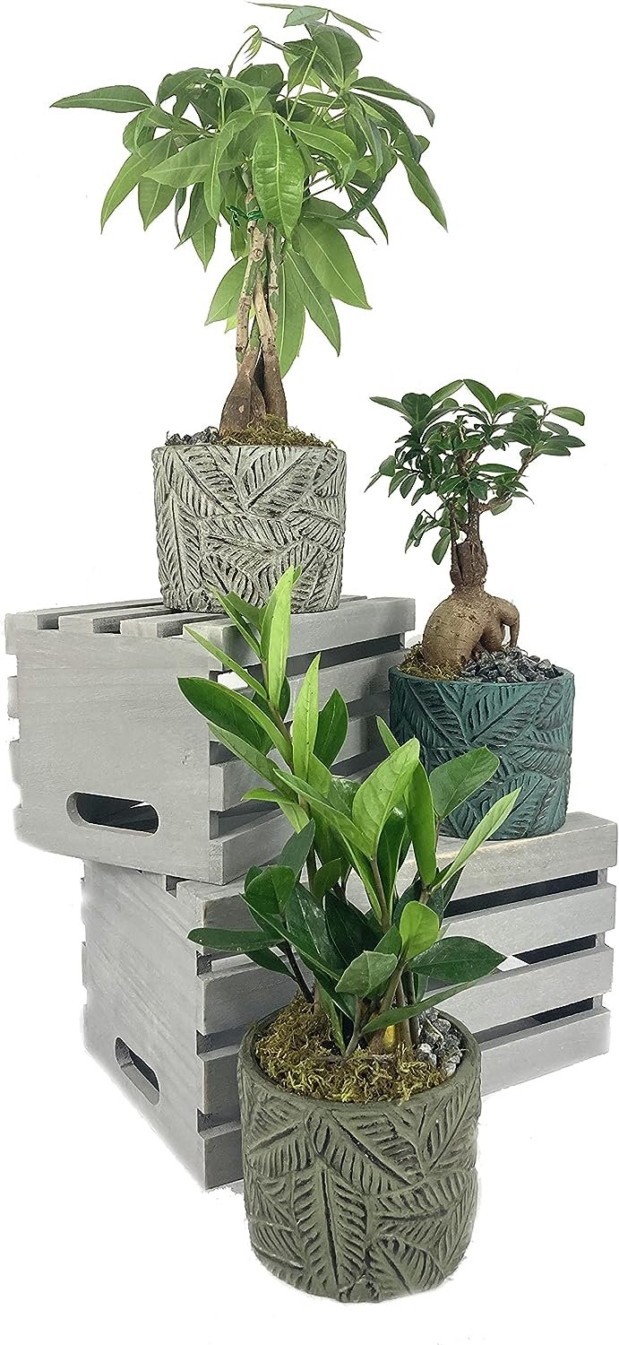 We are proud to introduce the Wekiva Foliage Bonsai Planter Collection. The Tropical Leaf Planters come in three different colors; teal, grey and green. With decorative rocks and moss, these planters are sure to add a splash of color and serenity to any indoor space, patio or kitchen. Varieties of plants are growers choice based on health, beauty and availability. Currently, our dish gardens come with one of the following varieties. ZZ, Ponytail, Ginseng, Juniper, Snow Rose, Yucca and Money tree. Unfortunately, we cannot guarantee specific varieties at this time. Our grower's choose only the most beautiful, healthy and well rooted plants available. Lighting Requirements: These plants prefer filtered indirect light. Direct sunlight will burn the leaves. Water Requirements: Keep the soil moderately moist, never soggy. These pots do not have drainage holes, so be very careful not to over-water.