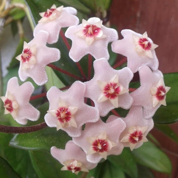 Hoyas have thick, waxy leaves that overflow from a pot in beautiful trailing vines. They bloom in clusters of sweetly smelling flowers like those of their distant cousin, the milkweed. The flowers themselves are dense and waxy, like finely sculpted porcelain, often appearing in pink or white. Native to tropical Asia and Australia, they live a long time and will quickly become some of your favorite houseplants. Hoya prefers either bright indirect light or sunlight for no more than 2 to 6 hours per day. If you choose the sunny option, place your plant on an east- or west-facing windowsill rather than a south-facing one so that it receives rays only during the morning or late afternoon rather than at midday, when direct sun might burn its leaves. During the spring and summer months, water your hoya after the top third or so of its soil has dried out but before the mix is parched all the way down—perhaps once per week, but that can vary with conditions. Irrigate it thoroughly enough that water runs from the drainage holes into the plant saucer, then discard the excess. In autumn and winter, cut back the watering to about once every 2 weeks. Some sources recommend 1 month without water during midwinter to spur the plant into blooming in spring. At any rate, never leave the plant sitting in water, such as in a container without drainage holes. It's a great plant to get if you want your house to feel like a jungle with the long vines, but also want extra color and liveliness. A Hoya is a combination between succulents and vining plants like a Pothos or Philodendron in the sense that they look like they're tropical plants, but they actually prefer to dry out, like a succulent.