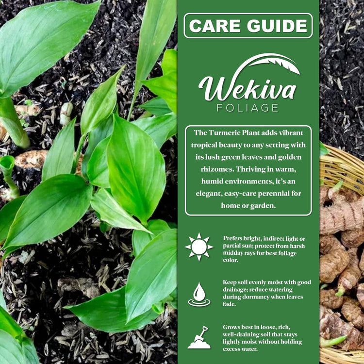 Physical Characteristics: This tropical perennial features large, smooth-edged leaves with a fresh green sheen and a slightly wavy texture. Mature plants can reach two to three feet tall, forming a dense canopy that shades the soil beneath. Beneath the surface, thick rhizomes mature into bright yellow roots that highlight the plant’s ornamental and distinctive appeal. Sunlight Requirements: Turmeric thrives in bright, indirect light or partial sun, where it can receive several hours of gentle morning light without the harsh intensity of the midday sun. Too much direct exposure can scorch the broad leaves, so positioning the plant where filtered sunlight prevails encourages healthy, lush foliage and vibrant seasonal growth. Watering Guidelines: Maintain consistently moist soil during the growing season, but ensure that excess water can drain freely. Turmeric responds well to regular watering schedules that prevent the soil from drying out completely. Reduce watering once the leaves begin to yellow and the plant enters dormancy, allowing the rhizomes to rest until active growth resumes. Soil Preferences: Plant Turmeric in a loose, well-draining mix that retains moderate moisture while preventing standing water. Rich, loamy substrates with good aeration support vigorous root and rhizome development. Container growers should select pots with ample drainage holes and a soil blend that balances water retention with proper airflow. Growth Rate and Maintenance: Turmeric is a moderately fast-growing plant during warm months, producing tall stems and lush leaves from underground rhizomes. Once established, it requires minimal maintenance aside from routine watering and occasional thinning of crowded clumps. During its dormant phase, allow the soil to dry slightly before resuming regular care when new shoots appear.