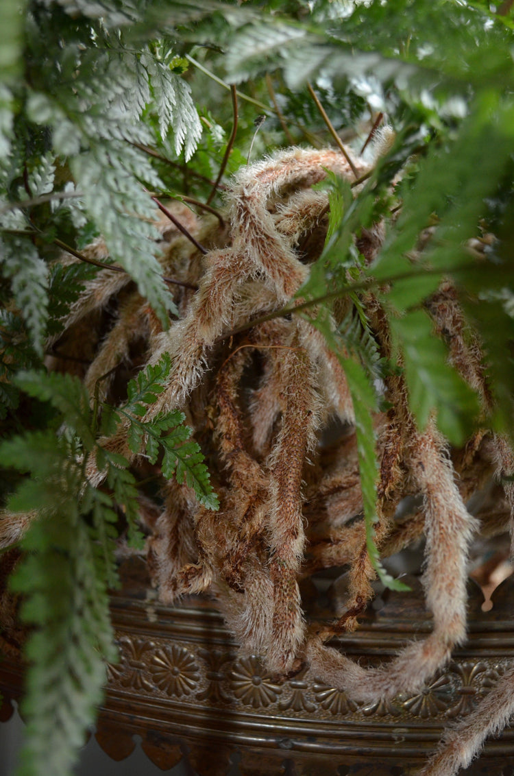 - Elegant, lacy fronds create a lush mound of evergreen foliage. The main attraction of this plant, however, are the furry rhizomes that hang over the side of the container. These light-brown, creeping rhizomes are covered with hairs that look like a rabbit's foot.