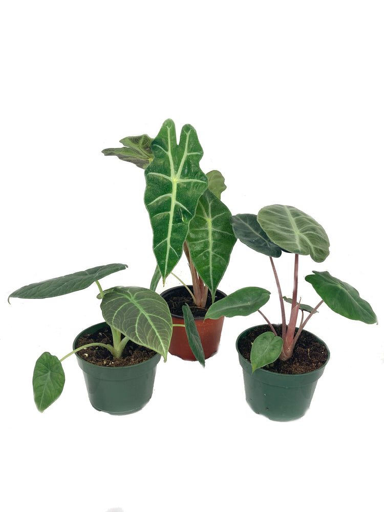 - Grown, packaged and shipped exclusively by Wekiva Foliage. PLEASE DO NOT ORDER IF THE WEATHER IS EXTREMELY COLD IN YOUR AREA. Plants within the Alocasia genus have similar basic traits because of their genetic connection, but the individual Alocasia varieties show vast differences in color, leaf size and shape, and size. This collection is grower's choice, meaning that our grower's will hand pick 3 different varieties based on health, beauty and current availability.