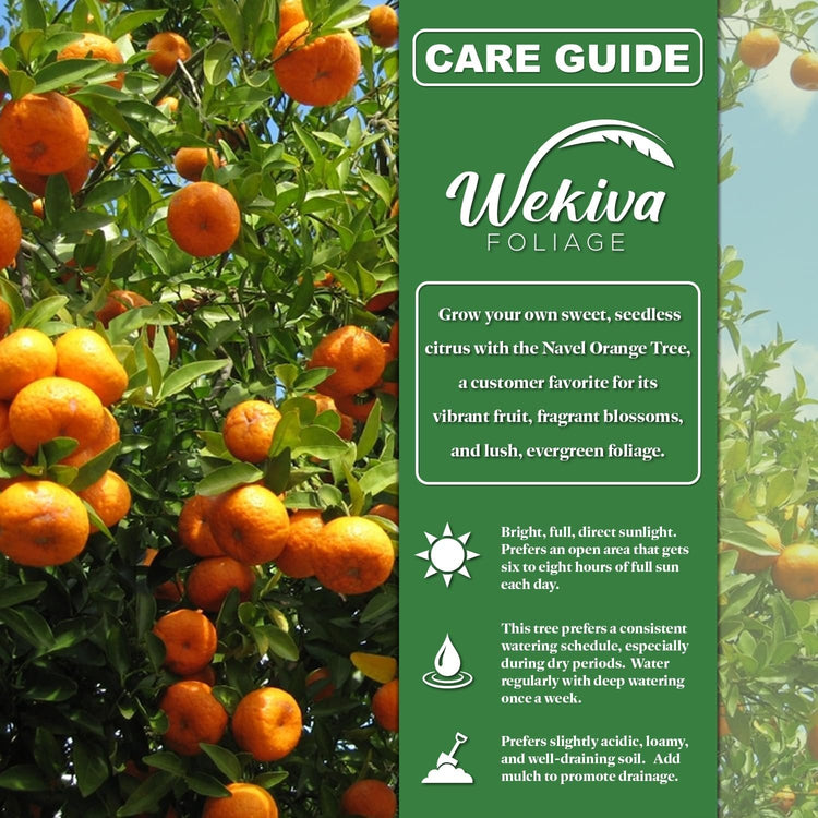 - Sunlight Requirements: Navel Orange Trees require full sun to thrive. Provide at least 6 to 8 hours of direct sunlight daily, whether planted in-ground or kept in a container on a sunny patio or balcony.