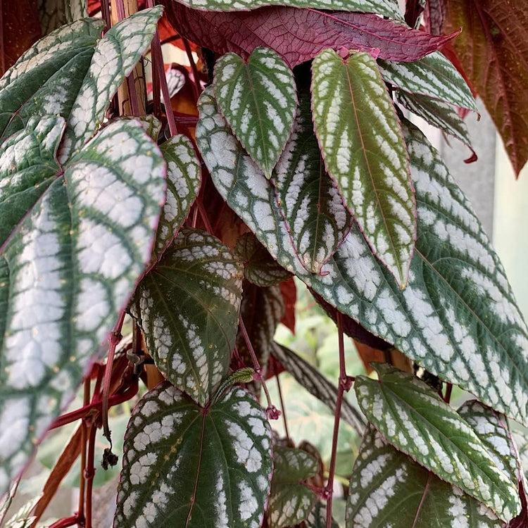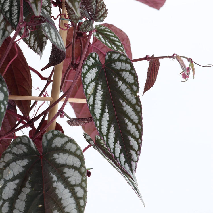 The Rex Begonia Cissus Discolor, often called the "Red Vine Begonia," is a visually captivating plant that brings vibrant color and an exotic touch to any indoor space. Renowned for its striking foliage, the Rex Begonia features large, heart-shaped leaves with a stunning combination of dark green, silver, and burgundy hues, creating a dynamic display. The undersides of the leaves are a rich red, adding to its appeal when viewed from different angles.