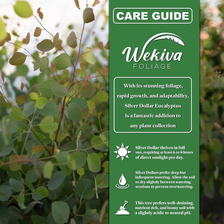 - Distinctive Appearance: Featuring round, silvery-blue leaves with a smooth texture, Silver Dollar Eucalyptus offers a visually striking addition to any landscape. Its aromatic foliage adds a refreshing fragrance, making it a popular choice for fresh and dried floral arrangements, wreaths, and decorative displays.