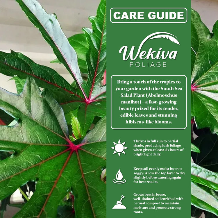 Adaptable and fast-growing, the South Sea Salad Plant thrives in warm, humid environments and performs well in containers, raised beds, or directly in the ground. It prefers consistent moisture and benefits from regular pruning to encourage bushy growth and fresh leaf production. When established in suitable conditions, it provides a continuous harvest of tender leaves throughout the growing season. Whether used as an edible foliage plant or a striking tropical accent, Abelmoschus manihot is a versatile addition to any home garden, offering both beauty and function in a single plant.