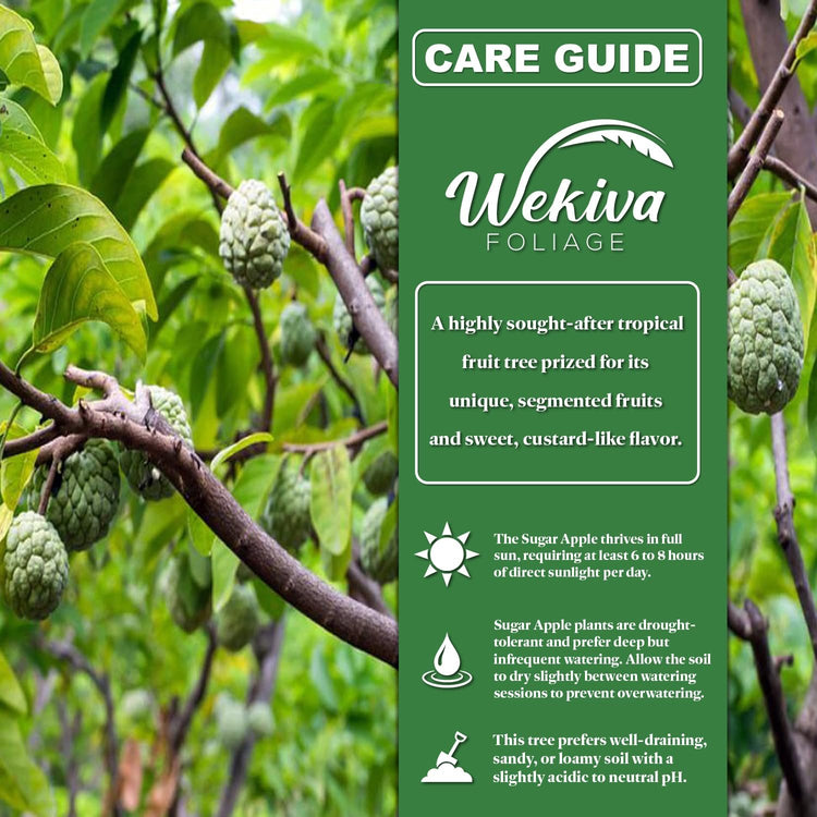 - Distinctive Appearance & Fruit Characteristics: Featuring slender, lance-shaped leaves and an open, spreading canopy, the Sugar Apple is an attractive addition to any tropical landscape. Its green, segmented fruit ripens to a soft texture, revealing creamy white pulp that is exceptionally sweet and aromatic.
