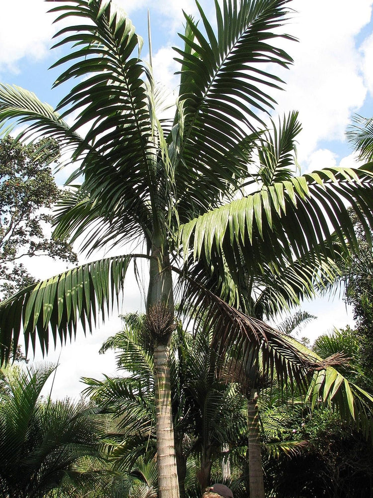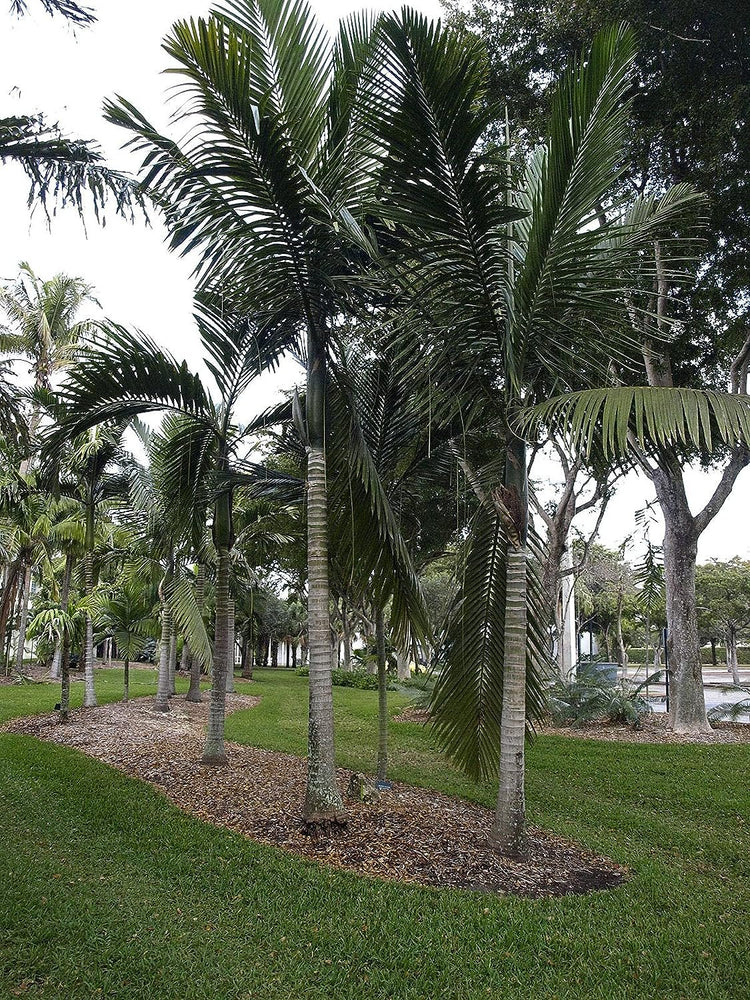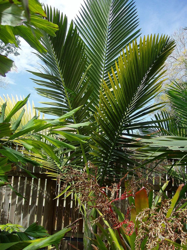 A magnificent, large, slender, very elegant, and tropical looking palm from New Caledonia that can reach to 30 m (100 ft) tall. It is rare in cultivation but very adaptable and has been successfully grown in many subtropical and tropical climates. It even takes the occasional light freeze without damage, surprising for a palm of rather tropical origin. Often used as an elegant screening barrier, what makes this palm attractive is its versatility and resilience in the landscape. Unlike your common Areca or Fishtail palms, the schefferi’s tight and compact crown allows it to be used in many settings without consuming much yard space. This species can grow in boh heavy sun to heavy shade and can eventually grow to a size upwards of 25 feet. Once established the palm can handle dry conditions well and is also cold tolerant. Aside from its appeal as a screener it also makes a beautiful accent piece and can be used as an individual specimen in design areas. Its deep purple fruits are both beautiful and powerful bird attractant. Various birds snack on the fruit as they pass through the landscape.
