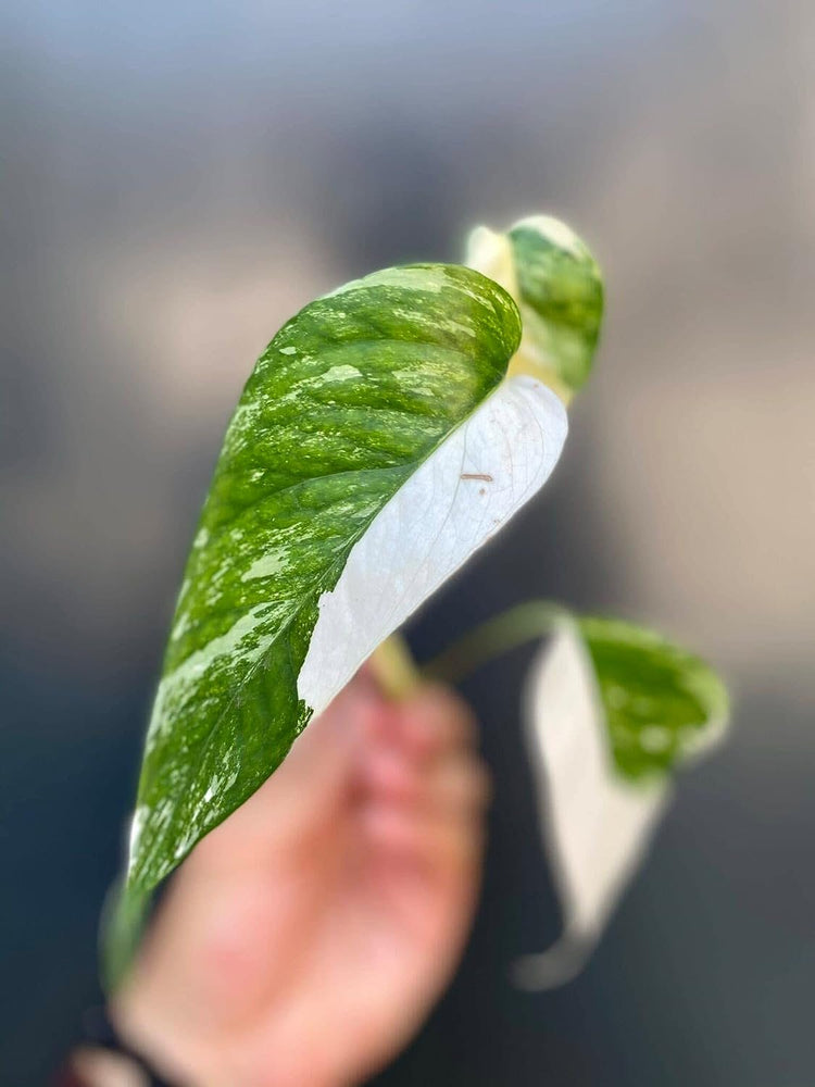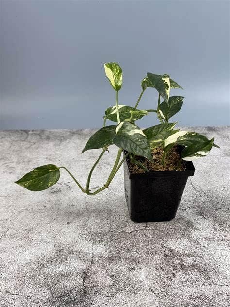 RETURNS WITH CUTTINGS REMOVED WILL NOT BE ACCEPTED. Epipremnum pinnatum 'Albo-Variegata' is a rare and highly valued pothos cultivar with green and white striped leaves that develop holes as the plant matures. Despite its beauty, it is less expensive than Monstera Albo or Thai Constellation, and is easier to care for. This pothos is faster growing and requires less attention, making it a more practical choice for those seeking a similarly stunning plant. Epipremnum pinnatum 'Albo-Variegata' is a variation of the Dragon Tail pothos that occurs naturally. Like its parent, it is a tropical climber that transforms the shape and appearance of its leaves as it grows. For optimal growth and to preserve its distinct green and white variegated leaves, this pothos cultivar should be placed in bright indirect light. A room facing east or west and positioned 2-3 feet away from the window is ideal. It's important to avoid direct sun exposure, as this can result in brown and dry leaf damage. To grow your Epipremnum Albo successfully, plant it in a potting mix that has good drainage and is rich in nutrients. You can either purchase a pre-made chunky aroid soil mix or make your own using a simple recipe. A good soil mixture for this plant can be made by combining equal parts of universal potting soil, orchid bark, and perlite or pumice. Epipremnum pinnatum Albo has average water needs. Wait until the top 2 inches (5 cm) of soil have dried out before thoroughly watering the plant. To determine when it's time to water, use your finger to check the soil moisture level. Over-watering can lead to waterlogged soil, so be careful not to water too frequently.