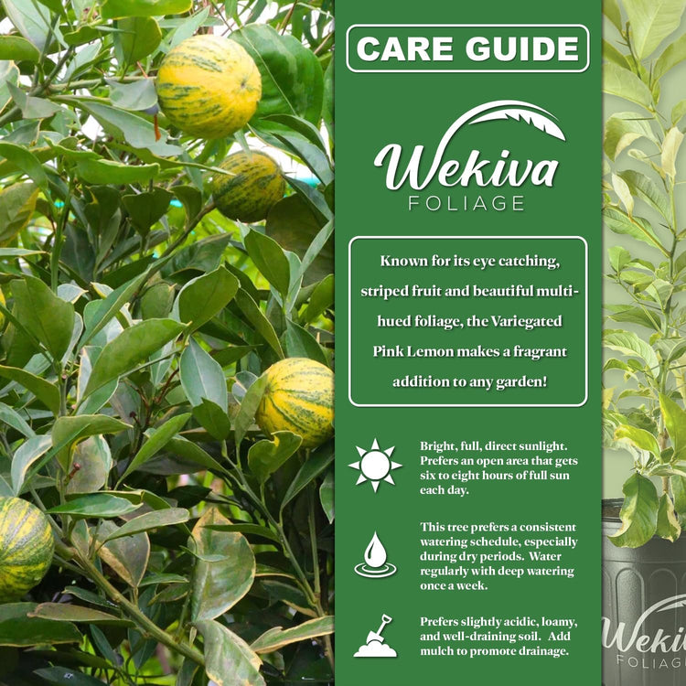 - Growth Habit and Size: The Variegated Pink Lemon Tree has a moderate growth rate, reaching heights of 6 to 10 feet when planted in the ground, or staying more compact when grown in containers. It can be pruned to maintain shape and manage size for indoor or patio use.