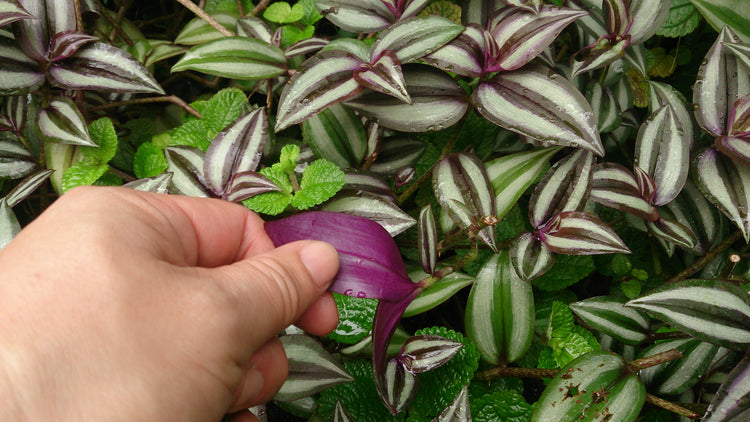 - Grown, packaged and shipped exclusively by Wekiva Foliage. Wandering jew plants have green, heart-shaped leaves with purple stripes and a silvery sheen to them. Depending on the variety, the leaves can be solid or variegated. Blooms are small with three petals and can be violet or white.