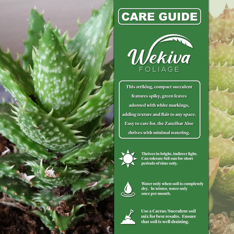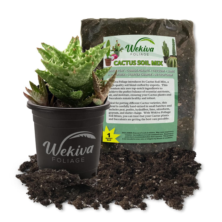 Elevate your indoor garden with the striking Zanzibar Aloe (Aloe Juvenna) paired with the perfect Cactus Soil for optimal growth. This combo offers everything your plant needs to thrive, providing you with a vibrant, low-maintenance addition to your space. This charming succulent, also known as the "Tiger Aloe," features eye-catching, spiky green leaves with white spots. It's known for its compact size, making it an excellent choice for any space, from windowsills to desks. Aloe Juvenna is also a great air purifier, adding both aesthetic and health benefits to your environment. A premium soil blend designed specifically for succulents and cacti, ensuring your Aloe Juvenna gets the perfect drainage it needs. This fast-draining mix reduces the risk of root rot and encourages healthy, thriving plants. Ideal for all types of cacti and succulents, it’s a must-have for your new Aloe.