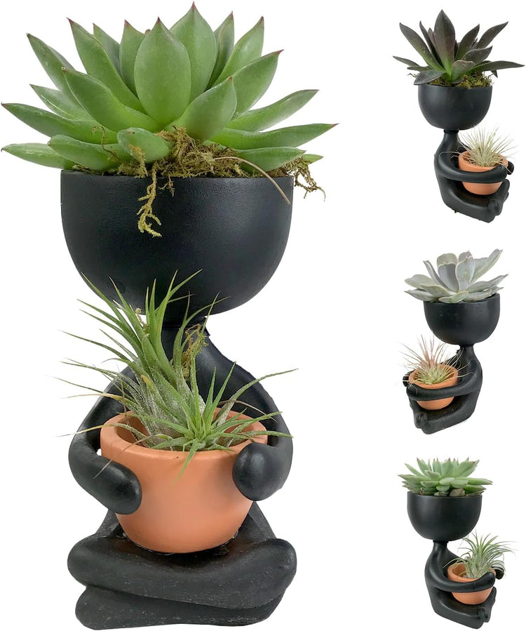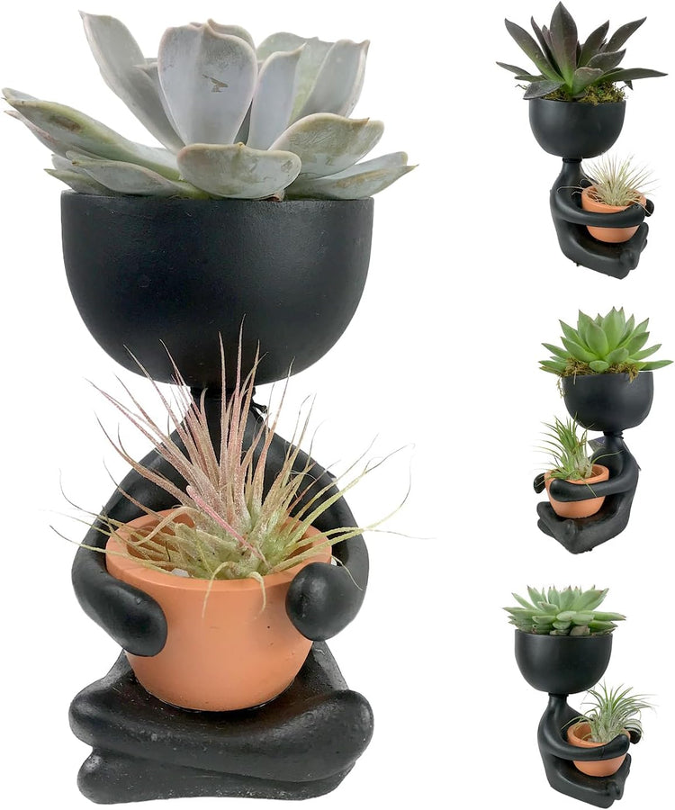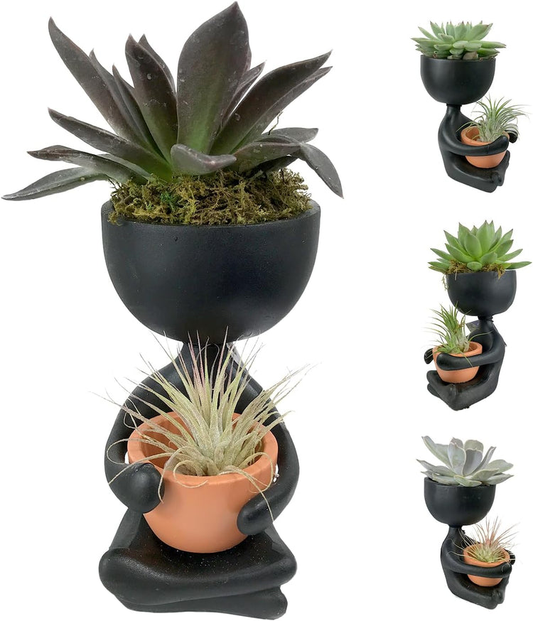 Create tranquility and natural beauty in any space with the Zen Harmony Planter. This decorative piece features a minimalist, black figure-shaped pot designed to hold a live succulent and an air plant, making it the perfect centerpiece for homes, offices, or gifts. The contrast of the lush, green succulent and delicate air plant against the sleek planter adds a touch of elegance and harmony to any environment. The included succulent is hardy and low-maintenance, thriving with minimal care and bright, indirect light. The air plant complements the design with its striking, spiky leaves that require no soil, creating a balanced, modern aesthetic. Whether you are a plant lover or simply seeking a relaxing accent piece, the Zen Harmony Planter effortlessly blends art and nature to enhance your decor.