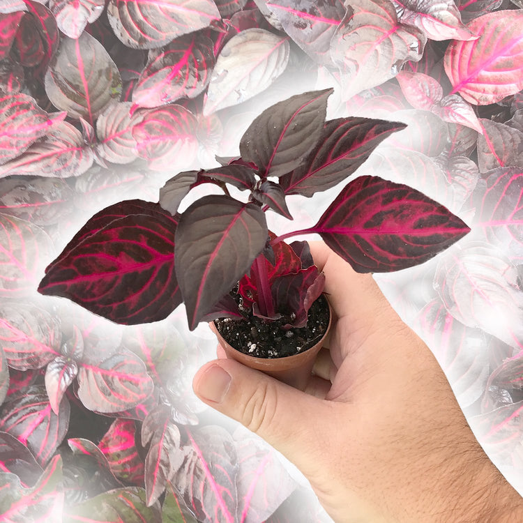 The Bloodleaf Plant (Iresine herbstii) is an eye-catching tropical ornamental known for its vivid foliage and dramatic color contrast. Often called Beefsteak Plant or Chicken Gizzard Plant, it features broad, oval leaves in deep shades of burgundy, crimson, and bright magenta, with prominent veins that create a striking glow in natural light. Its bold coloration makes it a standout accent for indoor displays, shaded patios, and mixed container arrangements. Even when used among other richly colored plants, its foliage maintains a distinctive appearance that instantly elevates any decorative setting. The plant naturally forms a full, bushy structure, making it ideal for creating lush, compact arrangements that retain a refined, sculpted shape.