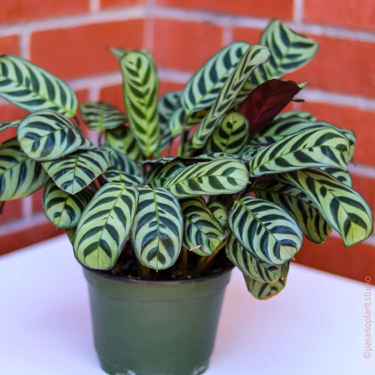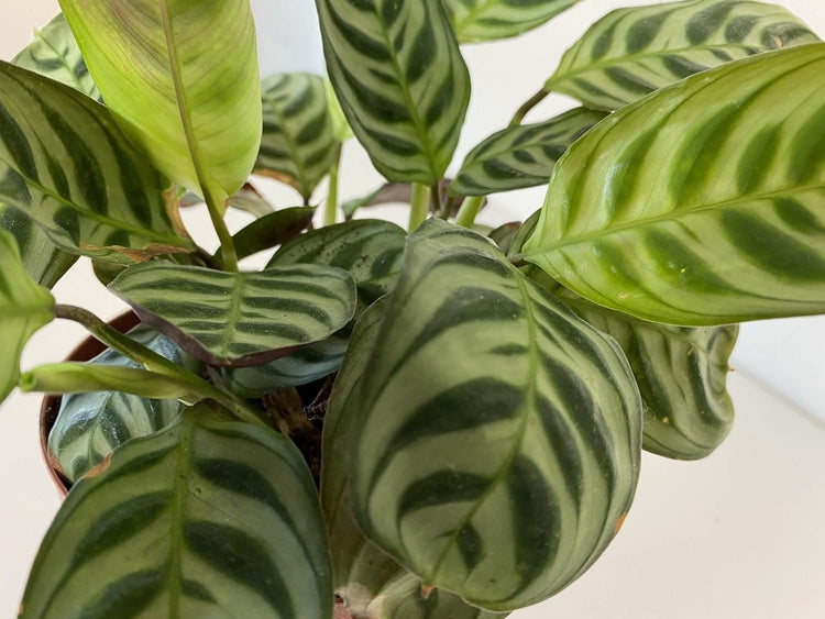 Calatheas are beautiful house plants grown for their stunning foliage. The top sides of the leaves look as if they have been painted with beautiful brushstrokes – they're often intricately patterned, in many shades of green. The undersides of the leaves are often burgundy red. This striking foliage has earned calatheas several nicknames, including the peacock plant, cathedral window plant, zebra plant and rattlesnake plant. Calatheas are also sometimes called the prayer plant as they are closely related to the maranta plant, also known as the prayer plant. However unlike marantas, they do not close their leaves up at night. Many calathea varieties have recently been moved into the genus Goeppertia, so you may now find them being sold under this name. The light requirements make this plant an attractive choice for lower-light homes, but please note: These plants do poorly in direct sun, which can bleach the leaves. Place your prayer plant in a part of a room that receives low to bright indirect light. As a rule, the darker the foliage—such as with the calathea ornata—the lower the light requirements. Like all houseplants, calathea enjoy filtered or dechlorinated water and can be a little more demanding than other houseplants. Simply fill your watering can and leave it overnight to dissipate the chlorine. If there are other chemicals in your tap water, try using filtered or distilled water instead. Prayer plants enjoy a humid environment, but many varieties can handle lower levels of humidity. Ideally, they prefer a humidity level of 50 percent or more, with more sensitive varieties requiring higher humidity levels—around 60 percent.