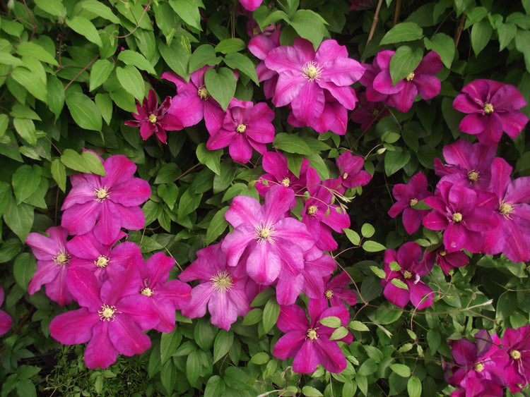 - Grown, packaged and shipped exclusively by Wekiva Foliage. 'Sunset' is a compact, deciduous climber. Profuse single deep reddish purple-pink flowers to 12cm across with 6-8 tepals with a satiny deep crimson bar and yellow anthers. Flowers early to late summer