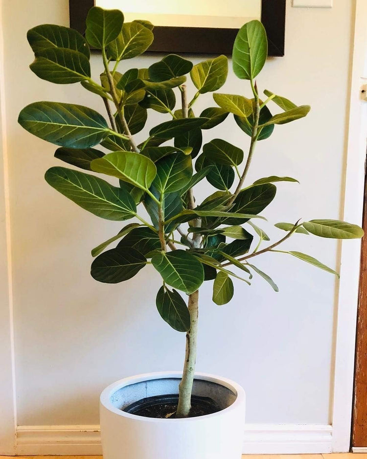 Ficus Benghalensis is a highly sought after ‘it’ plant right now and it’s easy to see why: its striking appearance combined with its easy care requirements makes for effortless ownership. Those deep green velvet leaves really make it a conversation piece and will look great in your living space. The Ficus benghalensis ‘Audrey’ is a banyan tree native to India and the surrounding region. It’s a type of Strangler Fig. Common names include Ficus Audrey, Bengal Fig, Strangler Fig and Banyan tree The open tree structure features emerald-green, oval leaves with prominent veins and a velvety texture. The leaves measure about three inches wide on mature specimens. Another highlight is its sturdy, light-colored trunk that thickens with age. The Ficus Audrey is more forgiving than the Fiddle-Leaf Fig – but that doesn’t necessarily say much. It shares the frustrating family habit of easily shedding leaves. Even if it’s not a beginner’s tree, however, Ficus Audrey can adjust to a range of light and humidity. Ficus Audrey bears a striking resemblance to the rubber plant, but it swaps out the glossy, moody, burgundy leaves for some that are small, matte, and emerald green; and the leggy and dark trunk for one that’s thick and white, almost birch-like.
