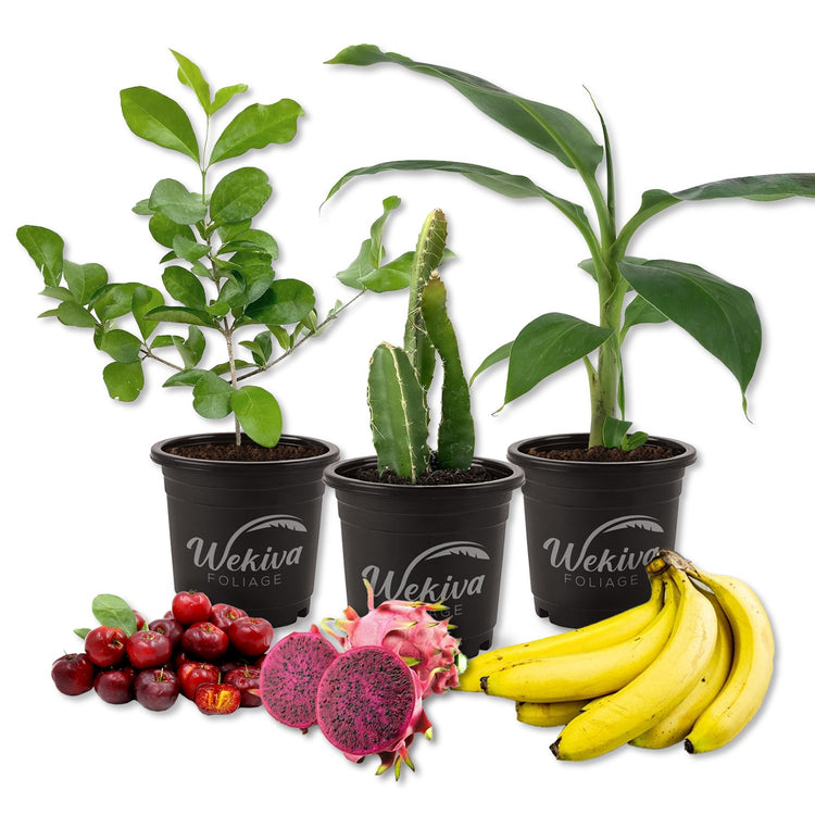 - Multipack starter plants - one each of banana tree, dragon fruit, and Barbados cherry tree. Variety of each individual plant is grower's choice based on health, beauty, and seasonal availability.