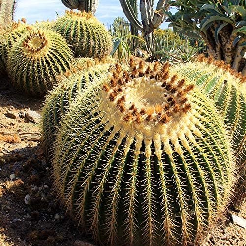 A must in any desert landscape! Golden spines line the ribs of this globe shaped cactus, with the top adorned by bright yellow flowers emerging from a patch of wool. A great addition to any desert, succulent or xeriscape garden. Plant these in mass for a dramatic, yet whimsical effect or set in groups amidst other drought tolerant succulent and cactus varieties. These stunning yellow globes will add an architectural interest to your garden or container planting. Perfect for flat desert landscapes because their clustering habit leads the eye to believe your garden has rolling hills. Although this plant does have golden spines along its ribs, they are gently curved, giving it the amusing nickname of Mother-In-Law's Cushion. Follow a regular watering schedule during the first growing season to establish a deep, extensive root system. Watering can be reduced after establishment.