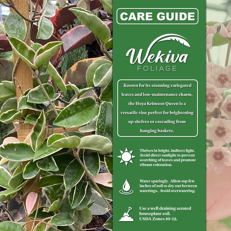 - Physical Characteristics: The Hoya Krimson Queen is known for its striking variegated leaves, which feature a beautiful blend of creamy white and deep green, with occasional pinkish edges or spots that add to its charm. As a member of the Hoya family, it has thick, waxy leaves that give it a unique, ornamental appeal.