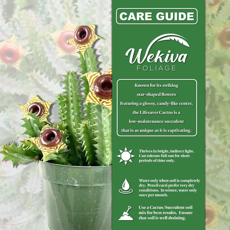 - Unique Appearance: The LifeSaver Cactus features eye-catching star-shaped flowers with a glossy red center that resembles a candy ring, surrounded by light yellow petals with burgundy zebra-like patterns. Its angular, ridged stems provide an attractive, modern aesthetic even when not in bloom.
