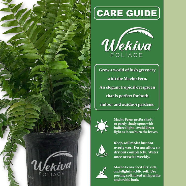 • The gracefully arching, big fronds of a Macho Fern provide a bold and lively display when used to decorate a room. Ferns thrive on humidity, so daily misting in winter months and a gravel and water-filled saucer beneath the pot in warmer months are highly recommended.