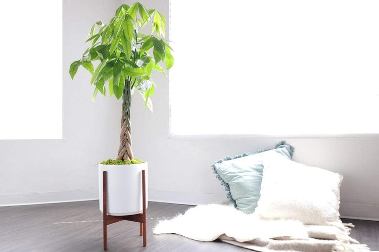 Pachira aquatica, better known as the money tree plant, has a reputation for being one of the easiest trees to grow indoors. Money trees are a tropical tree commonly used to add some green in homes as well as offices, lobbies, restaurants, and other public spaces. A money tree is a low-maintenance, pet-friendly plant with hand-shaped leaves. It grows large, green pods containing edible chestnut-like seeds and is native to Central and South America. Money trees prefer bright, indirect light and moderate-to-high humidity. Direct sunlight can lead to leaf-scorching, but the plants can do relatively well in low light. Exposure to too many drafts, though, may cause leaf loss. Heater vents and hot, dry air also need to be avoided. Money trees can survive outdoors in USDA zones 10 through 12, but otherwise need to be houseplants. Money trees are a favorite houseplant in feng shui, thought to bring good financial fortune when placed in the southeast section of your home—the area associated with money. In feng shui, it’s bad luck to place a money tree in your bathroom, as its positive energy may be drained away. From shiny, hand-shaped leaves to pretty braided trunks, the money tree is a can’t-miss indoor plant. It delivers lush good looks in any setting.