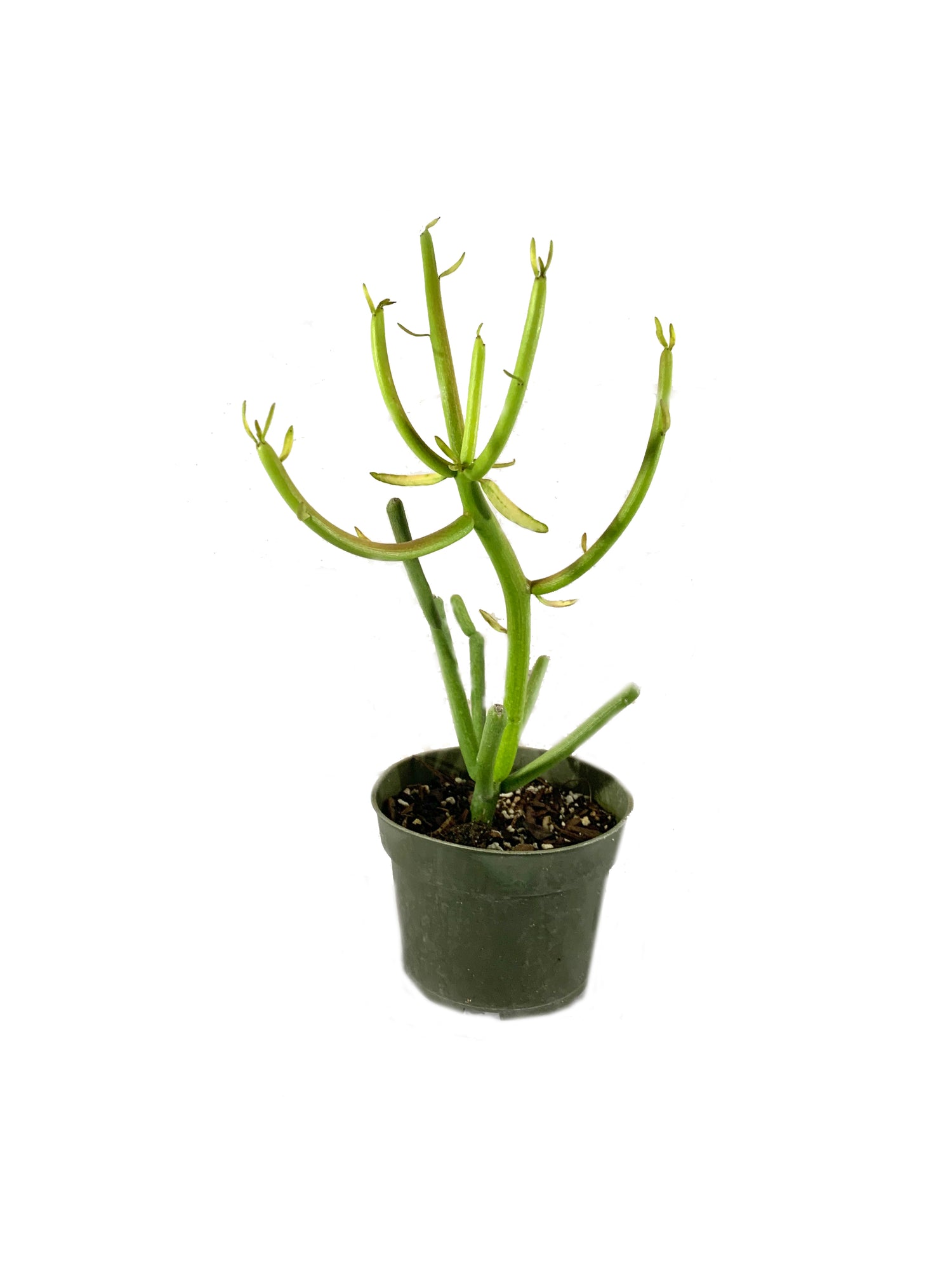 - This stem succulent is not a true cactus and photosynthesizes in its stems, not through the small leaves that appear at the end of its new growth (which are inconsequential to the plant’s health).