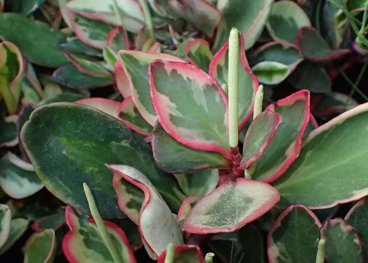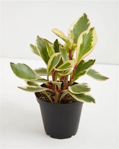 - Peperomia Ginny boasts oval-shaped, pointed leaves that feature a stunning blend of colors. The center of the leaves is a deep green, while the edges are cream with a blush of pink or red, creating a beautiful contrast that stands out in any room.