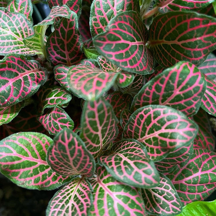 Plant Characteristics: Fittonia albivenis features ovate leaves with bold pink veining that spreads across a lush green backdrop. It forms a dense mat of foliage that typically grows 3 to 6 inches tall and can spread outward, making it ideal for hanging baskets, terrariums, or decorative planters.