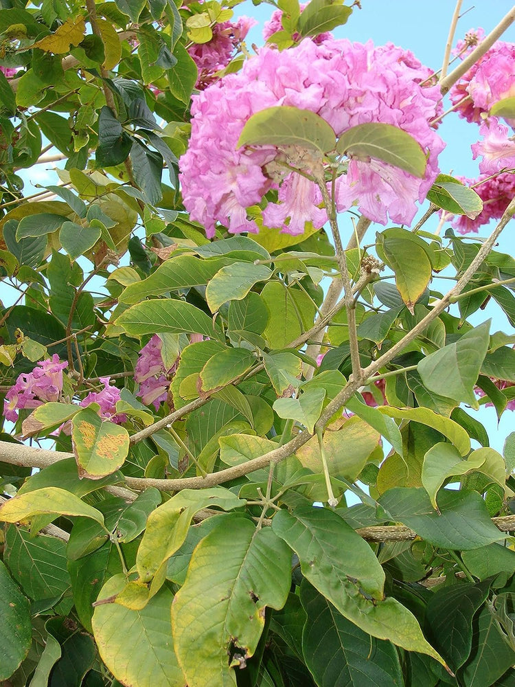 This briefly deciduous tree reaches 15 to 20 feet in height and has a fairly open canopy. Branching is often sparse allowing turf and other sun loving plants to grow beneath the canopy. The dark green, palmately compound, five-inch-long leaves are joined in late winter or early spring by the showy, trumpet-shaped blooms, appearing in dense, rose-pink to purple, terminal panicles. Trees will have a better form if trained to a single trunk and staked until they are six to eight feet tall, at which time they can be allowed to grow naturally. Its showy, trumpet-shape blooms unfurl in dense, rose-pink to purple clusters. This tree tends to have a shrubby habit when it is young. Train it to a single trunk by removing suckers and staking it while it is young. When it reaches 6-8 feet tall, it can be allowed to grow naturally. Purple Tabebuia should be grown in full sun on almost any well-drained soil but trees respond especially well to rich soil. Established trees are highly drought-tolerant. Need well-drained soil; respond well to regular fertilizing. All are useful as color accents and as stand-alone flowering trees for display. Larger types are excellent as street or park plantings; smaller species make beautiful patio trees or container plants.