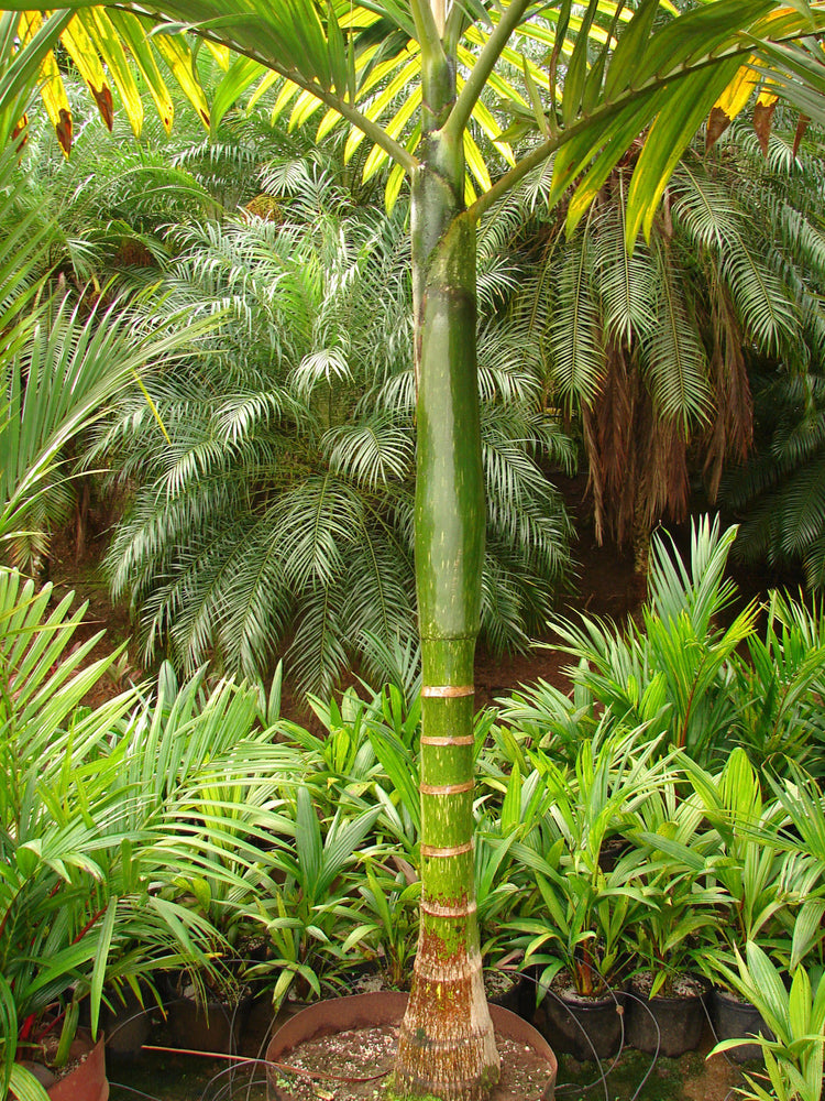 - The Red Feather Palm is a large, robust palm that has pinnate palm with broad leaflets. Their leaves are deep shade of green re-curving and drastically arching leaves. It has a swollen crownshaft which makes it very appealing sitting above the beautifully ringed trunk.