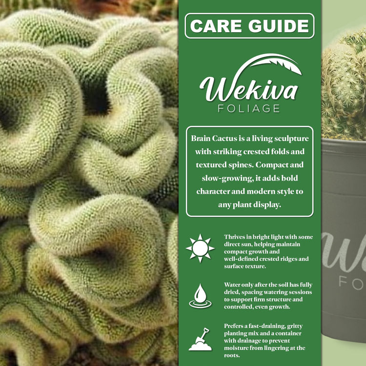 Physical characteristics: The most distinctive feature of this plant is its crested, wave-like structure that resembles folded fabric or brain tissue, setting it apart from standard columnar or globular cacti. Dense spination outlines each ridge, creating contrast and texture across the surface. The plant stays relatively low and broad, emphasizing form and pattern rather than vertical height.Sunlight requirements: Provide bright light to encourage defined ridges and balanced growth, with several hours of direct sun or very strong filtered light each day. Gradually introduce higher light levels to avoid stress from sudden changes. Indoors, a sunny window or equivalent light source works well, while outdoor placement should favor morning or late afternoon sun to support compact form and visible texture.Watering guidelines: Water with a measured approach, allowing the growing medium to dry fully between watering cycles. During active growth periods, water thoroughly and then wait until the container is completely dry before repeating. Reduce watering frequency during cooler months when growth naturally slows. Consistent spacing between waterings helps preserve the plant’s structure and avoids overly soft or stretched growth.Soil preferences: Use a fast-draining, mineral-based planting mix that allows water to move through quickly and limits prolonged moisture around the roots. Containers with drainage openings are essential for proper moisture control. A coarse blend with grit, sand, or small stone supports stable root anchoring while promoting airflow, creating conditions that favor steady, controlled development in containers.Growth rate and maintenance: Brain Cactus grows slowly and requires minimal routine maintenance, making it a low-effort choice for collectors and decorative displays. Occasional repositioning for even light exposure is usually sufficient. Its crested form naturally maintains its shape without pruning, and long periods can pass with little visible change, allowing the plant to remain tidy and consistent throughout the year.