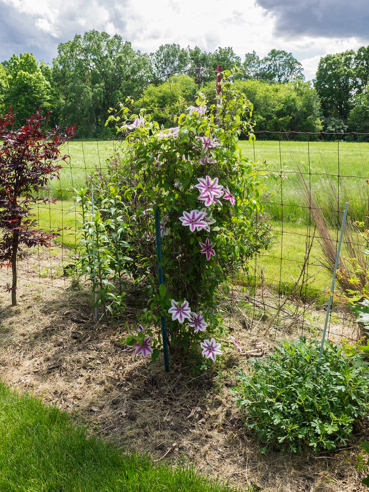 - Install a trellis or other support for your clematis to climb. "Carnaby" clematis are more compact than most clematis cultivars, reaching only 8 feet tall, so you don't need a large structure. The plants climb through tiny, twining tendrils and cannot climb thick pieces of wood or rock walls. String fishing line or wire through structures for the plant to climb.
