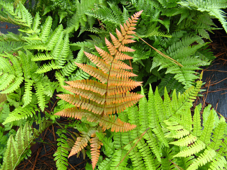 - Packaged and shipped exclusively by Wekiva Foliage. A bold and beautiful choice for shady borders and woodland gardens. A stunning dwarf fern with a flush of young papery fronds that emerge a copper-red color, then mature to a deep green. Spreads by underground stems. An herbaceous perennial.