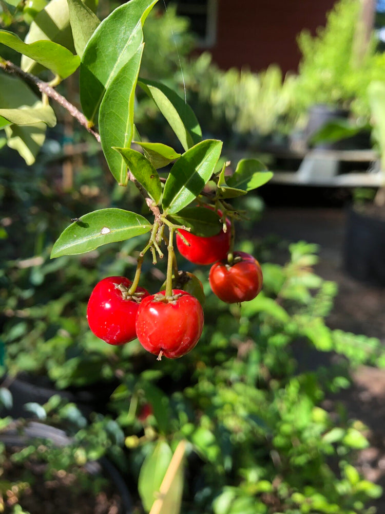 - Barbados cherry, or acerola, is a large, bushy shrub or small tree that reaches mature heights of about 12 feet (3.5 m.). This attractive shrub produces thick, bright green leaves. Small, pinkish-lavender flowers bloom from spring to fall, and may pop up year round in warmer climates – usually after irrigation or a rainfall.