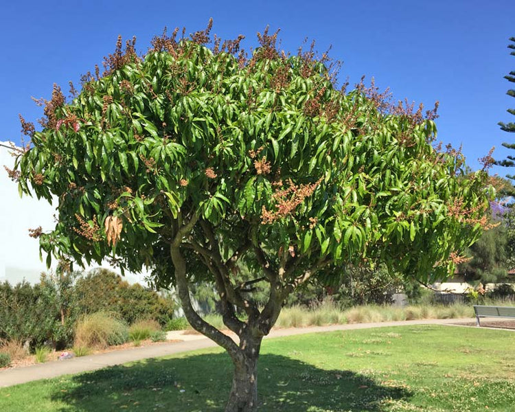 • In the right conditions, this tree forms a dense canopy of long oblong green leaves and rewards you with flowers in December through March; the fruit comes three to five months later. Mango trees planted in the garden are more likely to fruit than potted trees, but small varieties suitable for containers, such as a dwarf spotted mango, are capable of fruiting if they receive enough sunlight.