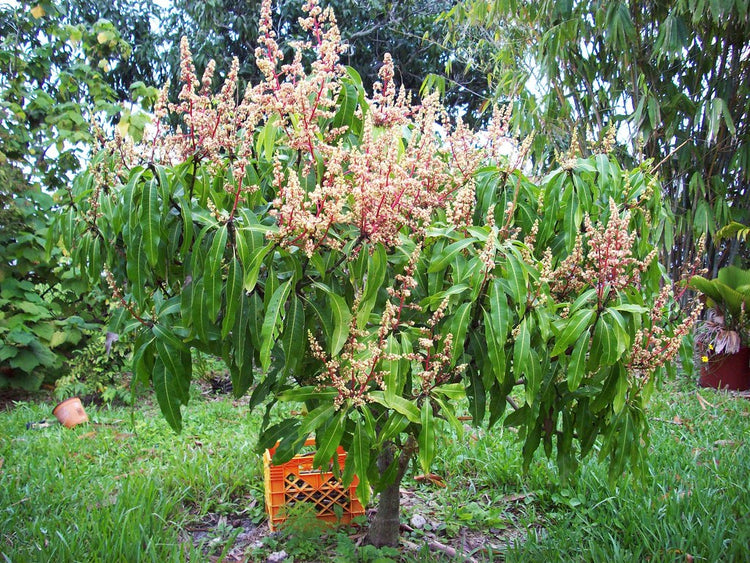 • In the right conditions, this tree forms a dense canopy of long oblong green leaves and rewards you with flowers in December through March; the fruit comes three to five months later. Mango trees planted in the garden are more likely to fruit than potted trees, but small varieties suitable for containers, such as a dwarf spotted mango, are capable of fruiting if they receive enough sunlight.