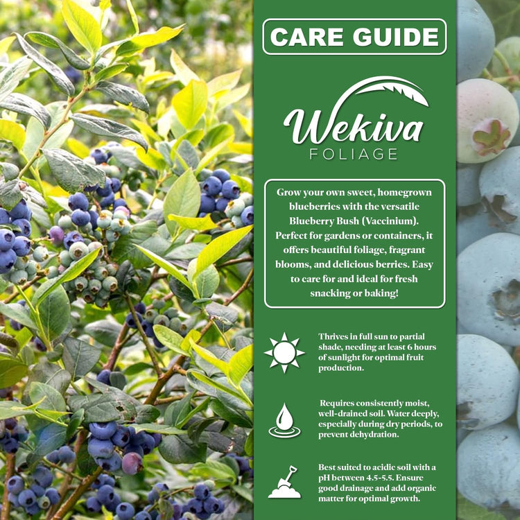 • Light Requirements: Blueberry bushes thrive in full sun to partial shade. Ideally, they should receive at least 6 hours of direct sunlight each day to produce the best fruit yields. Choose a location with good exposure to sunlight for maximum fruit production and healthy growth.