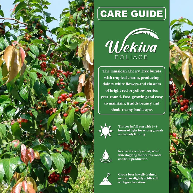 Physical Characteristics: The Jamaican Cherry Tree features slender, spreading branches covered with soft, green leaves that contrast beautifully with its delicate white blossoms. The small red fruits resemble cherries in color and shape, hanging in clusters that decorate the tree year-round. Its smooth grayish bark and airy canopy contribute to a graceful, ornamental presence in any landscape.Sunlight Requirements: The Jamaican Cherry Tree flourishes in full sun, requiring at least six to eight hours of direct light daily. Ample sunlight ensures strong branching, dense foliage, and steady flower and fruit production. While it can handle partial sun, optimal growth and continuous fruiting occur under consistent exposure to bright, warm sunlight conditions.Watering Guidelines: This tree appreciates a steady watering routine, especially during its early establishment phase. Maintain evenly moist soil but avoid standing water that can stress the roots. Once mature, it shows moderate drought tolerance, though consistent moisture during dry spells will encourage healthy foliage and prolonged fruiting cycles.Soil Preferences: The Jamaican Cherry Tree performs well in a wide range of well-drained soils, including sandy and loamy types. It prefers neutral to slightly acidic conditions and benefits from good aeration. Avoid compacted or poorly draining locations. Regular mulching helps conserve moisture and maintain a balanced root environment ideal for vigorous growth.Growth Rate and Maintenance: Known for its rapid growth, this tree can reach impressive size within just a few seasons. Pruning helps maintain shape, manage height, and improve airflow through the canopy. Its adaptability allows it to thrive with minimal intervention once established, making it an excellent choice for gardeners seeking a resilient and low-maintenance specimen.