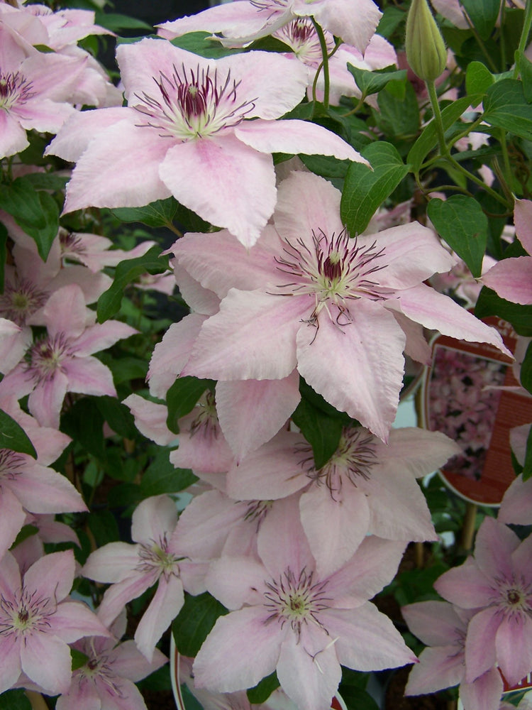 - ‘Pink Fantasy’ is a hybrid clematis vine that typically grows 6-8’. It features single, pale pink flowers (to 4-5” wide) with deeper pink bar and stamens. Flowers freely bloom from July – September. Branches are clad with bipinnate to pinnate-compound dark green leaves.
