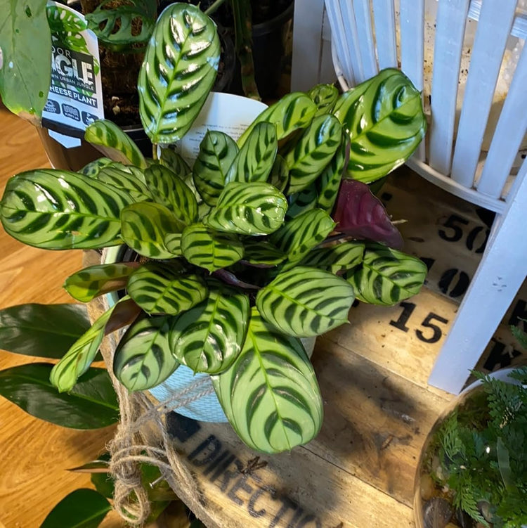 Calatheas are beautiful house plants grown for their stunning foliage. The top sides of the leaves look as if they have been painted with beautiful brushstrokes – they're often intricately patterned, in many shades of green. The undersides of the leaves are often burgundy red. This striking foliage has earned calatheas several nicknames, including the peacock plant, cathedral window plant, zebra plant and rattlesnake plant. Calatheas are also sometimes called the prayer plant as they are closely related to the maranta plant, also known as the prayer plant. However unlike marantas, they do not close their leaves up at night. Many calathea varieties have recently been moved into the genus Goeppertia, so you may now find them being sold under this name. The light requirements make this plant an attractive choice for lower-light homes, but please note: These plants do poorly in direct sun, which can bleach the leaves. Place your prayer plant in a part of a room that receives low to bright indirect light. As a rule, the darker the foliage—such as with the calathea ornata—the lower the light requirements. Like all houseplants, calathea enjoy filtered or dechlorinated water and can be a little more demanding than other houseplants. Simply fill your watering can and leave it overnight to dissipate the chlorine. If there are other chemicals in your tap water, try using filtered or distilled water instead. Prayer plants enjoy a humid environment, but many varieties can handle lower levels of humidity. Ideally, they prefer a humidity level of 50 percent or more, with more sensitive varieties requiring higher humidity levels—around 60 percent.