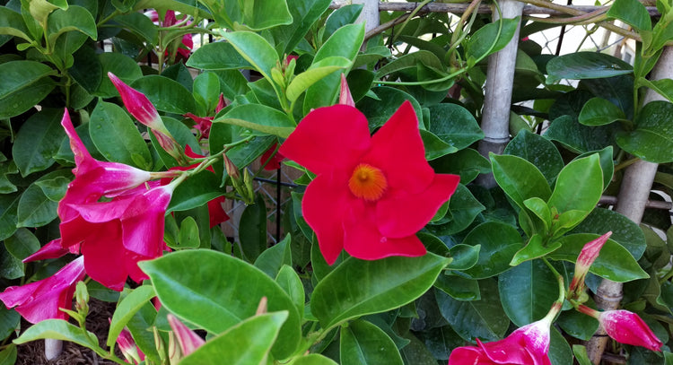 • Grown, packaged and shipped exclusively by Wekiva Foliage. Mandevilla, also known as rocktrumpet, is a genus of flowering vines that grow in tropical and subtropical climates. The five-petal flowers are often showy and fragrant, typically coming in shades of pink, red, and white, occasionally with yellow throats.