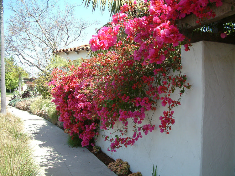 • This vigorous, showy vine shines with bright, magenta-red, petal-like bracts. Creates a fine cover for patios or arbors, and is a dramatic groundcover for banks when allowed to ramble unsupported.