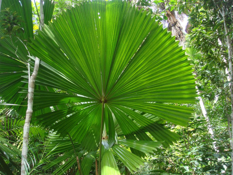 - The crown consists of large fan-shaped leaves. The leaves up to 2 meters long, with feather-like fronds give this palm a gracefull appearance. The leaflets are bright green above with a silvery underside.