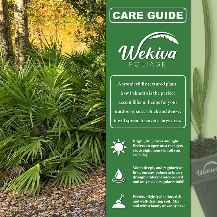 A hardy evergreen that tolerates heat, drought, and poor soil once established, the Green Saw Palmetto offers beauty and resilience in equal measure. It produces small, creamy-white flowers in spring, followed by dark berries that attract native birds and wildlife. Whether planted in clusters as a groundcover or featured as a striking specimen, this adaptable palm thrives in full sun or partial shade. Its slow growth and low maintenance needs make it a perfect choice for gardeners seeking long-lasting greenery with minimal upkeep.
