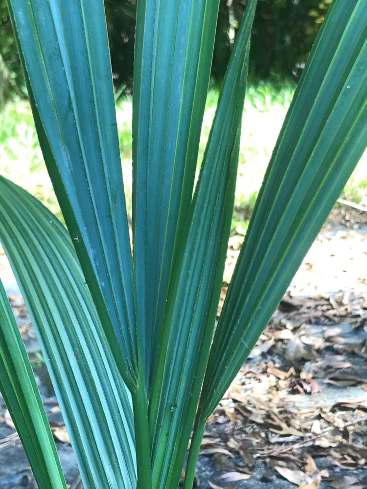 - The dark green, costapalmate leaves vary in size depending on the age of the plant but may reach a length of 5 feet. The fan-shaped leaves of the bluestem palmetto are palmately lobed and segmented with the segments split to 2/3 their length.