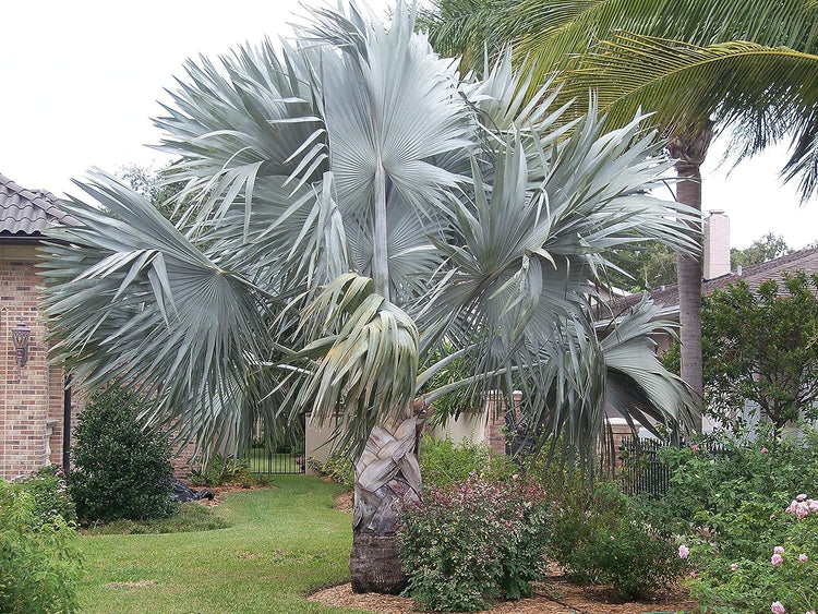The Bismarck Palm has a full crown of large, circular, silvery blue, fan-shaped leaves and a tall, columnar trunk. In seedlings and young plants, the leaves are tinged with an unreal purple color. Bismarckia develops fairly quickly into a large and stunning tree that is excellently suited for the subtropical or tropical garden, for parks, and for breathtaking avenues. It is tolerant of drought and a few degrees of frost and wants a place in full sun, such as it enjoys in the highland savannas of its native home of Madagascar. There is only one species within this genus. It is a stately single trunk palm that has a good sized trunk and, over many decades, can get tall. First introduced into the commercial nursery market about twenty years ago, it is being used both commercially and in the home garden in increasing frequency. It is commonly called the Bismarck Palm. Either as a single specimen or in groups, this is a strikingly beautiful species. It is most commonly known for its silver blue color. Remember that most gardeners and enthusiasts love blue palm trees.