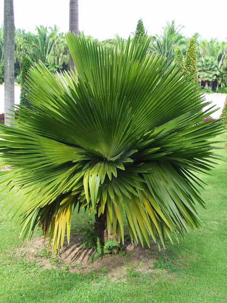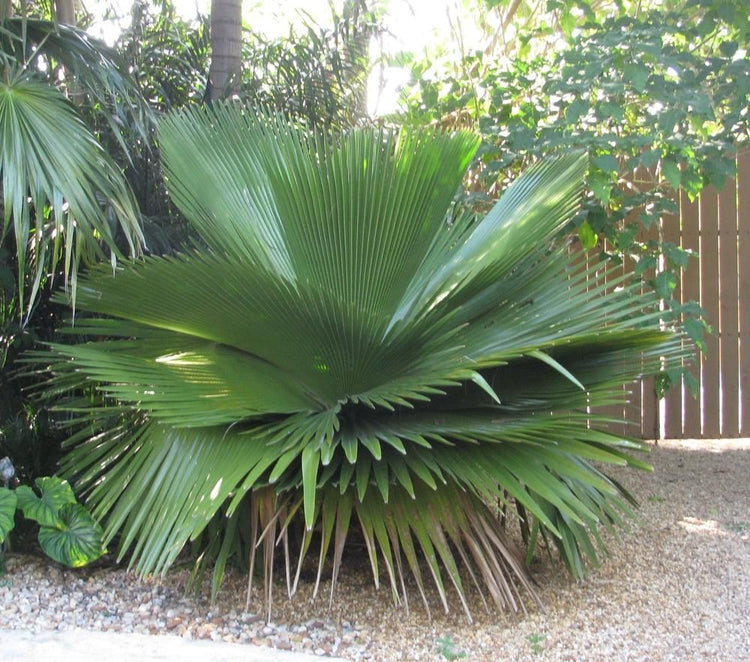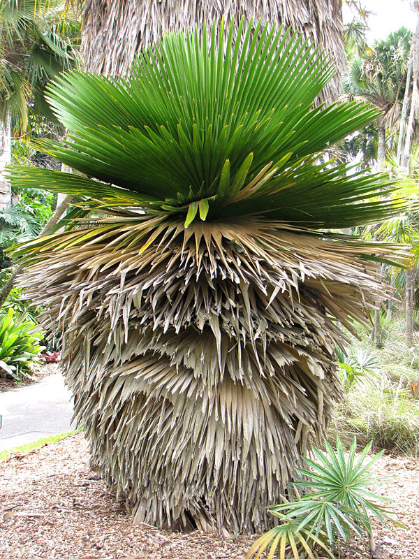 • Grown, packaged and shipped exclusively by Wekiva Foliage. This species from savannas in western and central Cuba is a most curious palm. It has large circular leaves that have virtually no leafstalk and that do not drop from the stem after they have served their function. This results in a dense tuft of leaves atop a haystack-like structure under which the stem is hidden away.