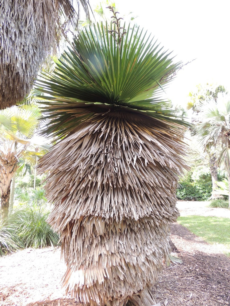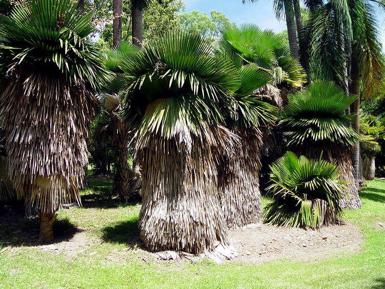 • This unique palm has erect leaves, that grow in the form of a spiral. The leaves are fan-shaped and arise from the trunk, with almost no petiole (leaf stem). This gives the tree a "skirted" appearance, with the persistent older leaves forming its unique and characteristic "petticoat".