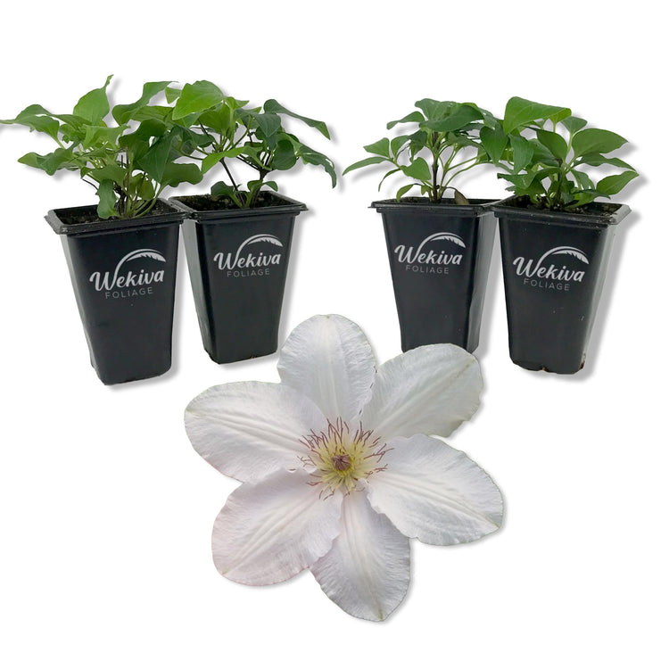 Clematis Guernsey Flute is a refined and compact climbing vine that brings timeless elegance to any garden. This cultivar is celebrated for its pristine white, star-shaped flowers and its unique bud formation. The plant's name, "Guernsey Flute," refers to its habit of holding newly opened flower buds in a flute-like shape for an extended period before they fully open, creating a graceful and delicate appearance. Reaching a mature height of 3 to 4 feet, Clematis Guernsey Flute is ideal for small gardens, patios, or containers. Its compact size and repeat blooming from late spring to early autumn make it a versatile choice for adding vertical interest and continuous color. The plant thrives in partial shade, where its elegant blooms can be appreciated without the stress of intense midday sun. With its long flowering season and manageable size, Clematis Guernsey Flute offers both beauty and practicality for gardeners seeking a low-maintenance yet striking vine.Physical Characteristics: The Clematis Guernsey Flute features elegant, star-shaped flowers that are initially held in a unique flute-like formation before fully opening. The blooms are a pure white color with a delicate, silvery sheen and reach up to 4–5 inches in diameter. The plant’s foliage consists of dark green, ovate leaves, which create a striking backdrop for the vibrant flowers.Sunlight Requirements: Clematis Guernsey Flute thrives in full to partial sunlight, ensuring vibrant blooms when given at least 4–6 hours of direct sunlight each day. In too much shade, the plant may not flower as abundantly.Watering Frequency: While this clematis prefers consistently moist soil, it is important to avoid waterlogging. Ensure the plant receives regular watering, particularly during dry spells, to keep the roots hydrated without soaking the soil.Soil Preferences: Guernsey Flute clematis prefers well-draining, rich, loamy soil. It performs best when planted in soil that retains moisture but also provides good drainage to prevent root rot.Growth Rate: Known for its vigorous growth, this clematis quickly climbs fences, trellises, or other structures. It reaches a height of up to 8–10 feet and spreads about 3–4 feet wide, making it ideal for covering vertical surfaces.